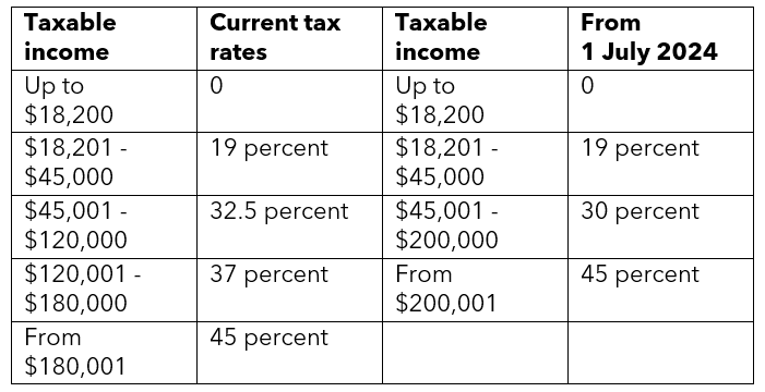 Personal income tax rates – this year’s budget has confirmed the stage 3 tax cuts from 1 July 2024 representing a tax saving of up to $9,075 per person: